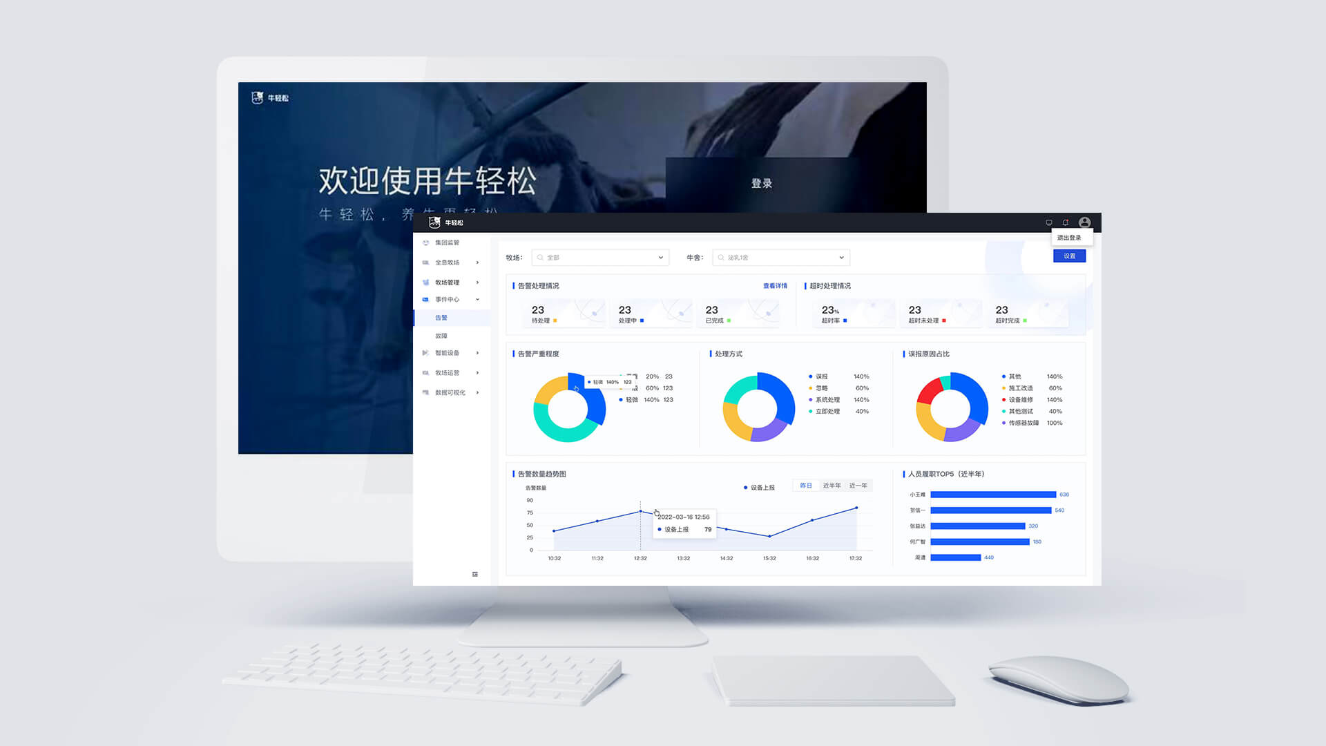 牛輕松對牧場的智能風(fēng)機(jī)系統(tǒng)、噴淋系統(tǒng)、視頻監(jiān)控系統(tǒng)、智能照明系統(tǒng)、能源監(jiān)測系統(tǒng)、環(huán)境監(jiān)測系統(tǒng)、工單系統(tǒng)等進(jìn)行統(tǒng)一的管理與聯(lián)動配置。產(chǎn)品的應(yīng)用實(shí)現(xiàn)牧場內(nèi)所有設(shè)備的一鍵全連、協(xié)同聯(lián)動及可視化管理,輔助牧場能夠綠色的、高效的、可持續(xù)盈利的長足發(fā)展。
